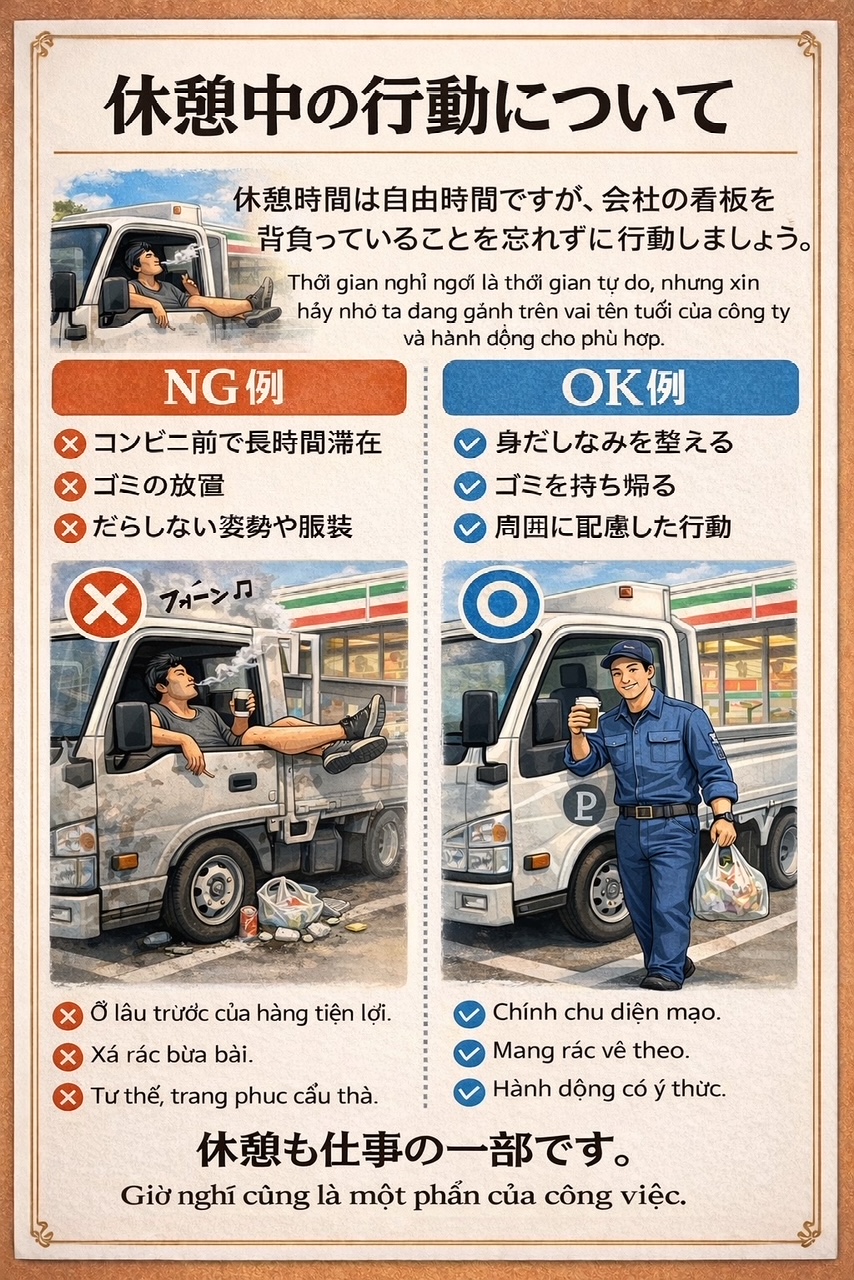 コンビニ駐車場でのすごし方。トラック内での態度。現場での服装や立ち振る舞い。